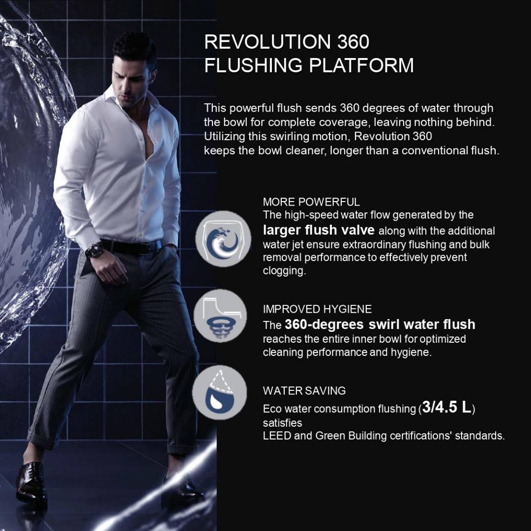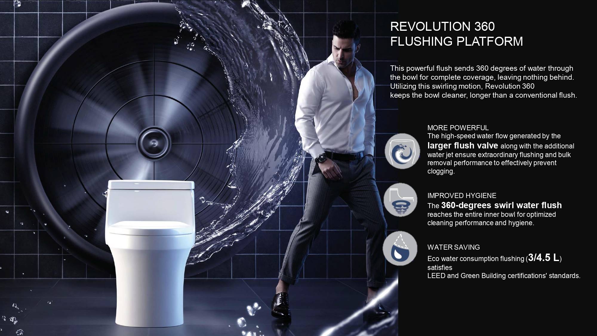 - Revolution 360 Flushing Platform – this powerful flush toilet sends 360 degrees of water through the bowl for complete coverage, leaving nothing behind.