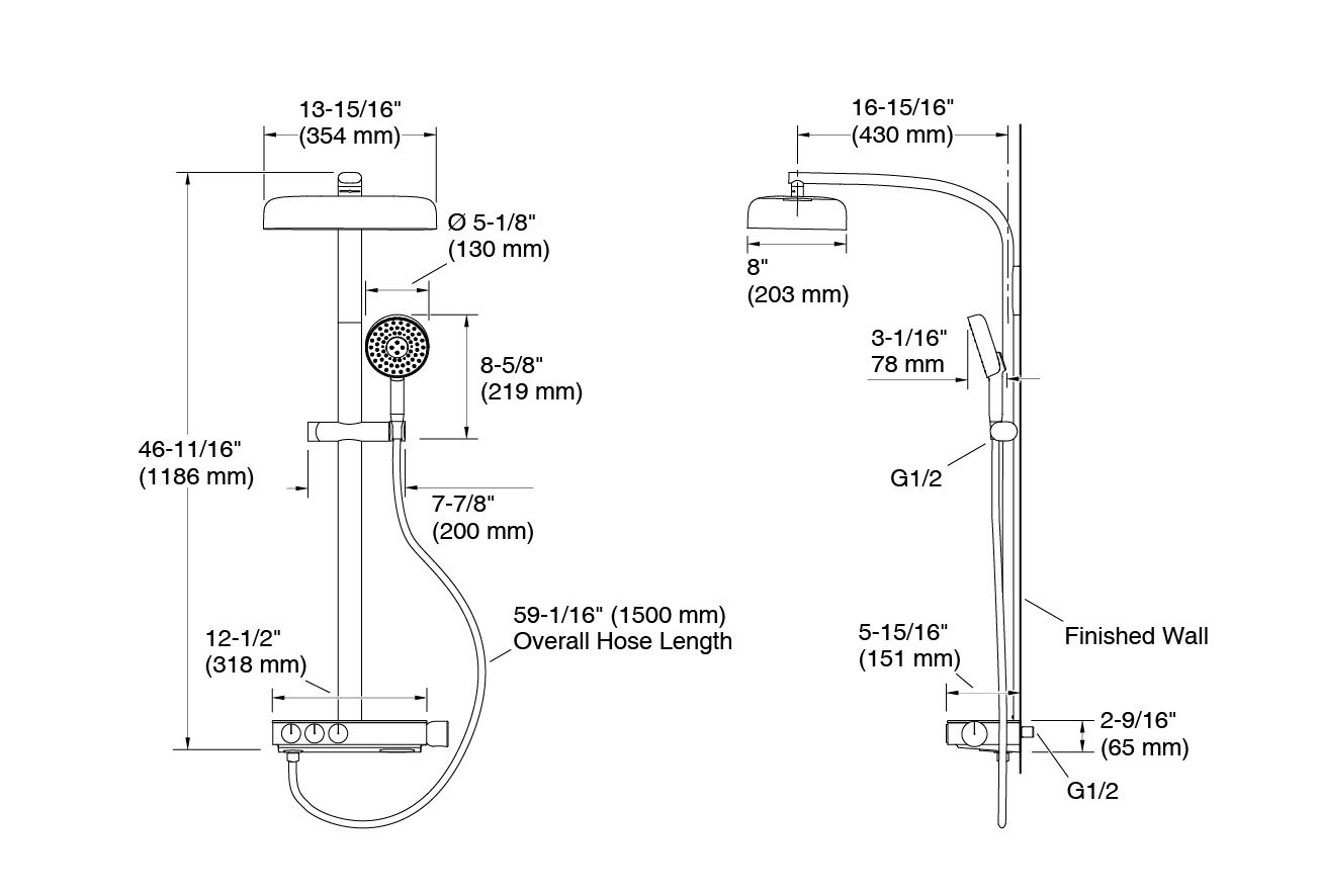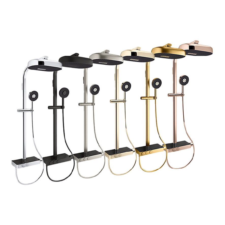 - Includes shower column, rainhead, handshower, hose, thermostatic valve and control panel